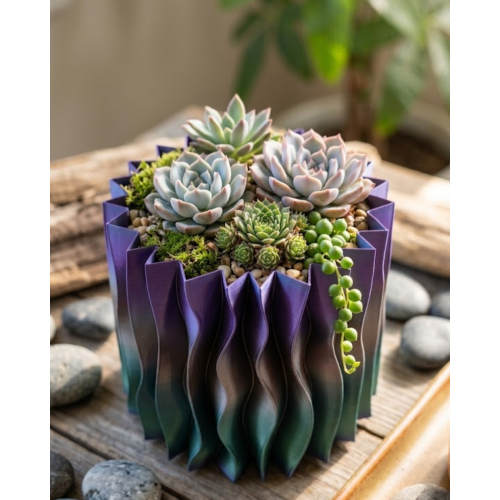 3D baskı teknolojisi ile üretilen bu dekoratif vazo, yüzeyindeki dalgalı form sayesinde ışık ve gölge oyunları oluşturur. Bu durum ürüne görsel bir derinlik kazandırırken aynı zamanda modern bir tasarım estetiği sunar. Bu nedenle yalnızca bir vazo değil aynı zamanda dekoratif bir sanat objesi olarak da değerlendirilebilir.