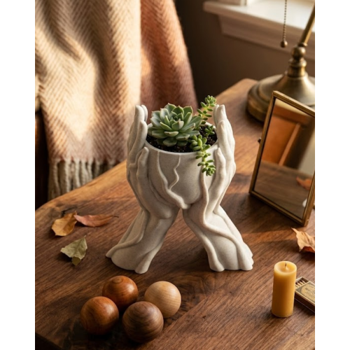 Dekoratif 3D el tasarımlı vazo saksı, modern dekorasyon anlayışı ile sanatsal tasarımın birleştiği estetik bir dekoratif üründür. Özgün formu sayesinde yaşam alanlarında dikkat çeken bir dekor objesi olarak kullanılabilir. İki elin bir objeyi tutuyormuş gibi tasarlanması ürüne hem güçlü bir görsel etki hem de modern bir karakter kazandırır. Bu tasarım yalnızca bir saksı veya vazo olarak değil aynı zamanda sanatsal bir dekoratif obje olarak da değerlendirilebilir.